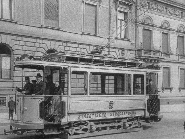 Triebwagen 17 um 1904/1905 auf der Kaiserstraße Richtung Bauhofstraße. Das Linienschild zeigt Weisenau (rot/weiß). In Gegenrichtung zeigt es Bismarckplatz. (Sammlung Jörn Müller)