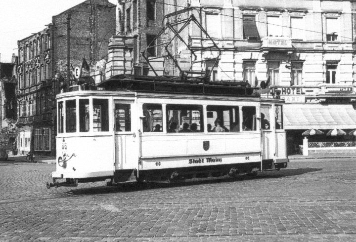 Der Triebwagen 66 überquert als Verstärkerfahrt im Jahr 1950 den Bahnhofsplatz in Richtung Mombach oder Gonsenheim (H. Christ, Wiesbaden)