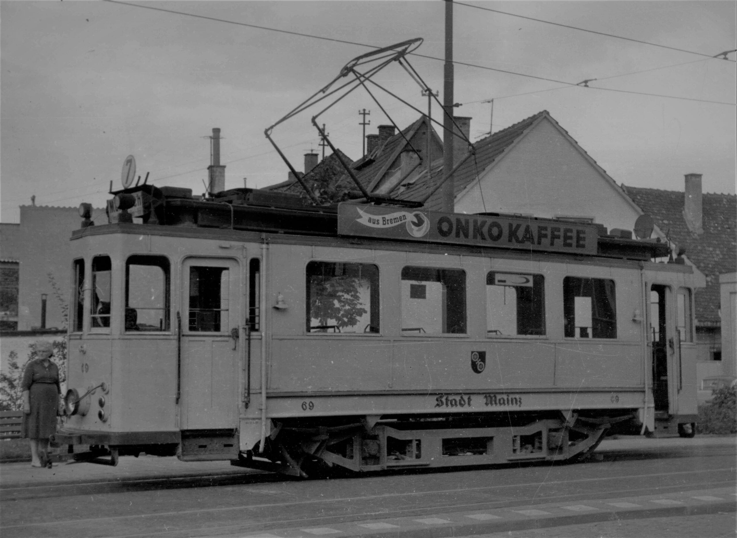 Der Triebwagen 69 im Jahr 1962 an der 1963 stillgelegten Endstelle in Mombach (Bild Harald Neise)