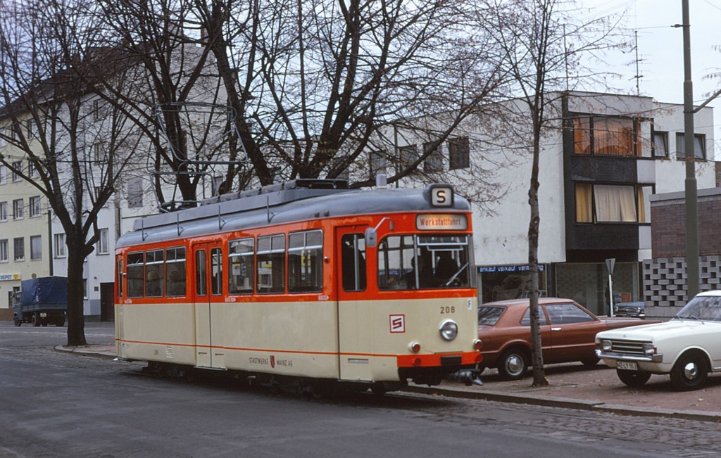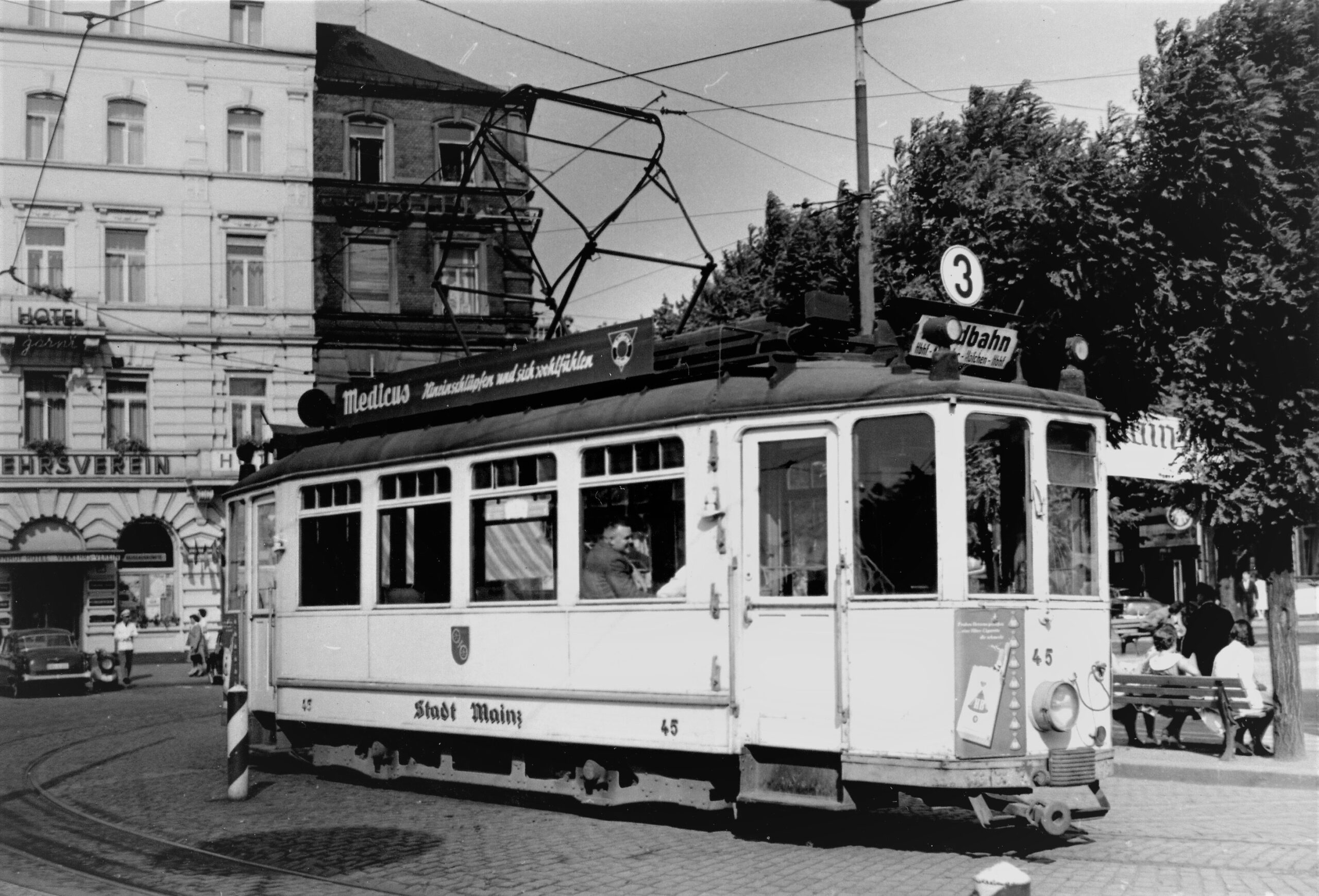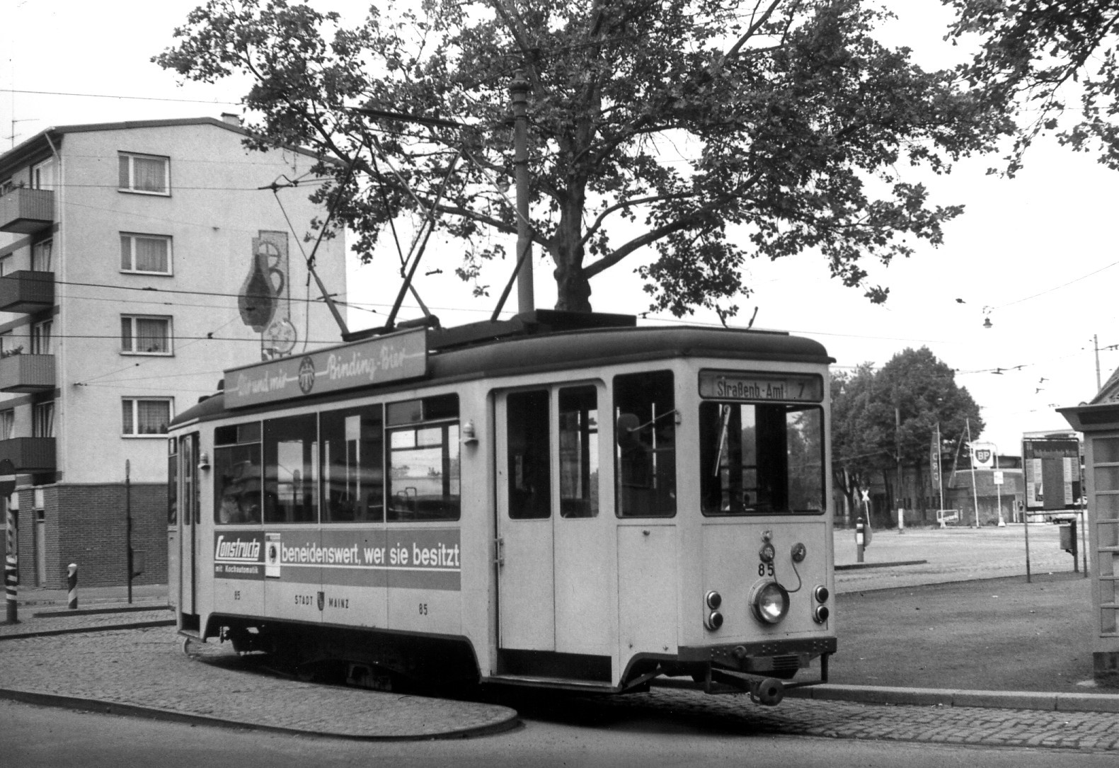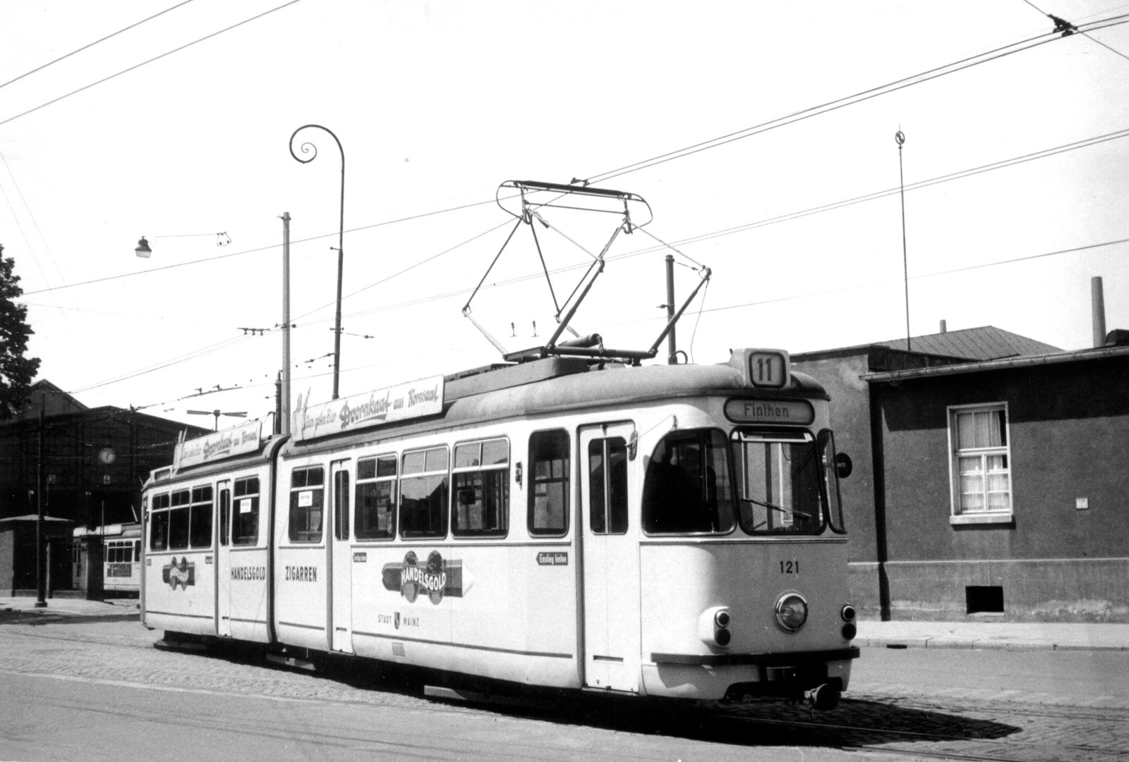 Der Triebwagen 221, hier noch mit der Nummer 121, beginnt seine Fahrt am Betriebshof (Kaiser-Karl-Ring) in Richtung Finthen im Jahr 1963 (Bild Harald Neise)